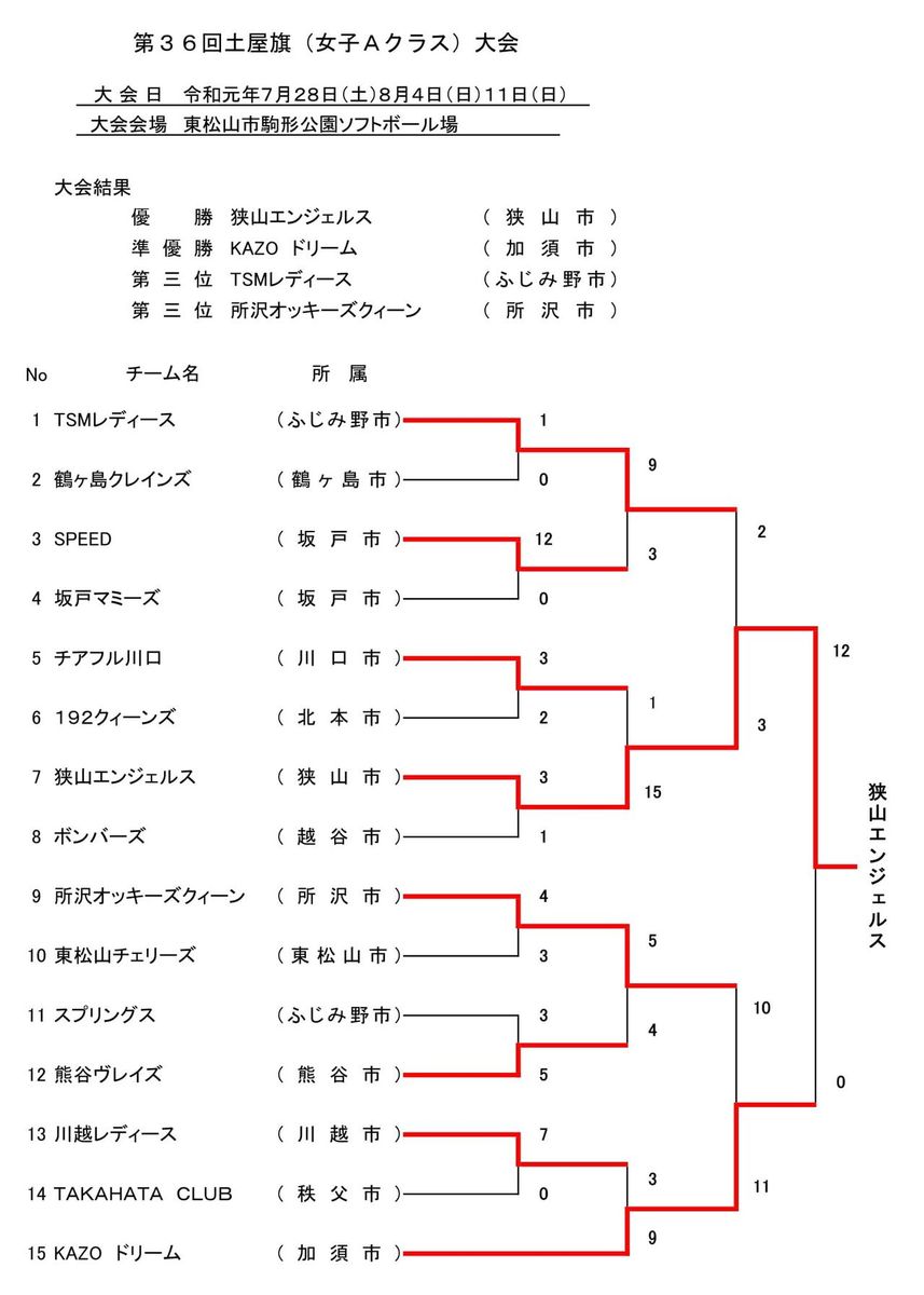 7月28日(土)、8月4日(日)、11日(日)、埼玉県東松山市・東松山市駒形公園ソフトボール場にて、『第36回土屋旗(女子Aクラス)大会』が開催され、狭山エンジェルスがKAZOドリームを12対0で破り優勝した。そのほかの結果は、下記のとおり。
