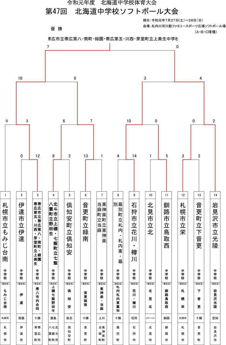 7月27日(土)~28日(日)、北海道帯広市・札内川河川敷ファミリースポーツ広場ソフトボール場にて、『第47回北海道中学校体育大会』が開催され、帯広八・南町・緑園・帯広五・川西・上美生中が光陵中を7対0で破り優勝した。そのほかの結果は、下記のとおり。