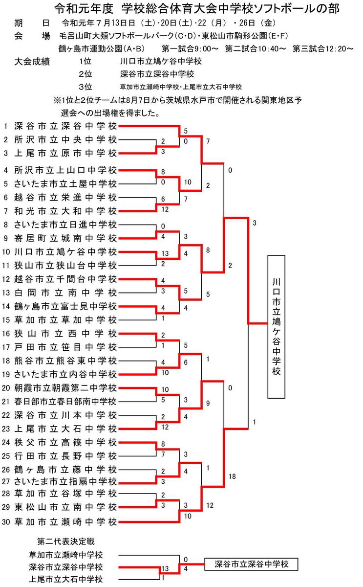 7月13日(土)、20日(土)、22日(月)、26日(金)、埼玉県毛呂山町・大類ソフトボールパーク、東松山市・駒形公園、鶴ケ島市・運動公園にて、『令和元年度中学校総合体育大会埼玉県予選会』が開催され、鳩ケ谷中が瀬崎中を3対1で破り優勝した。そのほかの結果は、下記のとおり。