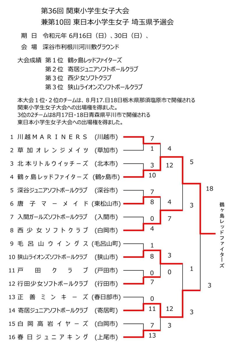 なお、優勝した鶴ヶ島レッドファイターズ、準優勝の寄居ジュニアクラブは8月に栃木県那須塩原市で開催される関東小学生女子大会、3位の西少女クラブ、原島スワローズは8月に青森県平川市で開催される東日本小学生女子大会への出場権を得た。そのほかの結果は、下記のとおり。