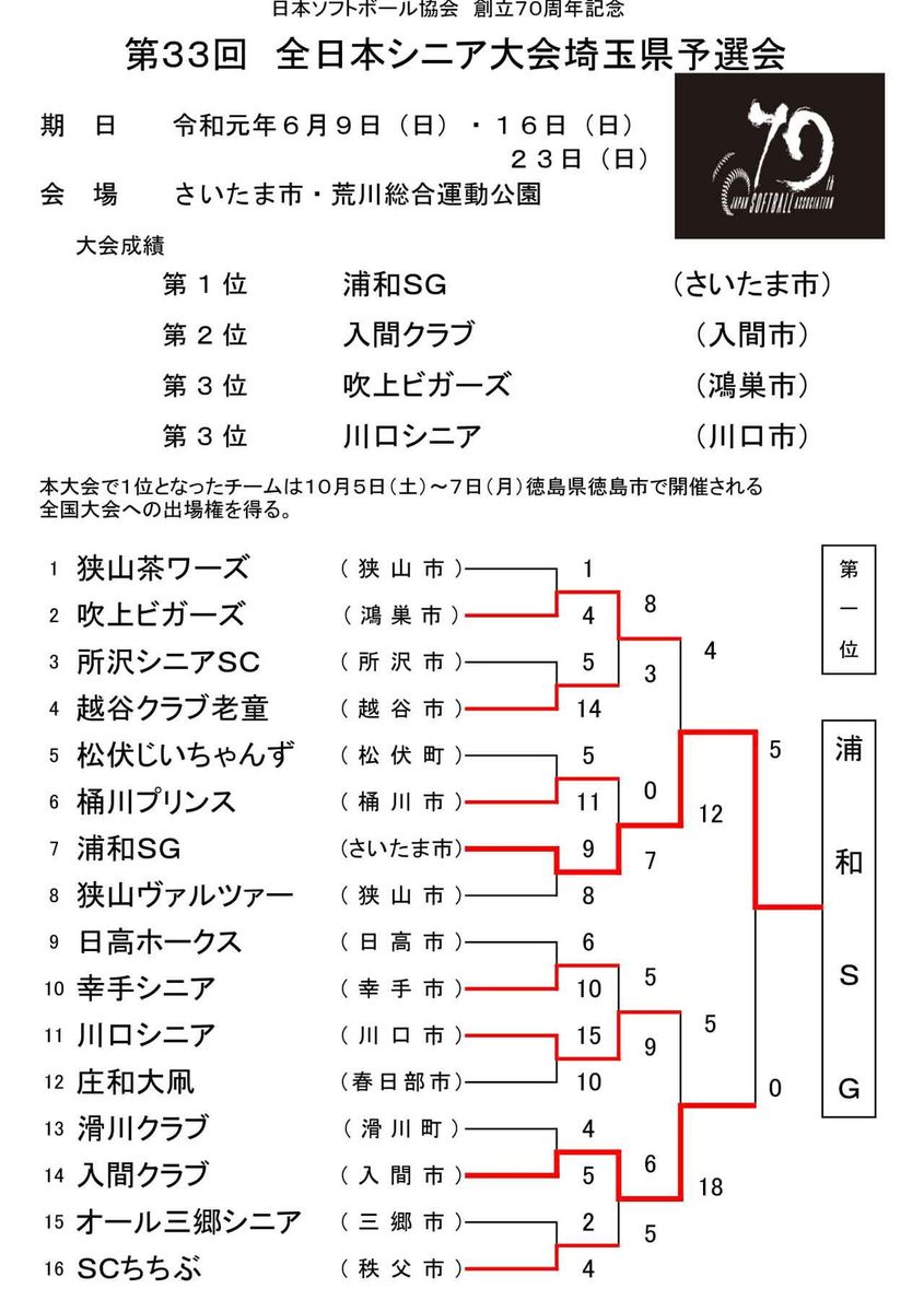 6月9日(日)、16日(日)、23日(日)、埼玉県さいたま市・荒川総合運動公園にて『第33回全日本シニア大会埼玉県予選会』が開催され、浦和SGが入間クラブを5対0で破り、優勝に輝いた。なお、浦和SGは10月に徳島県徳島市で開催される全国大会への出場権を得た。そのほかの結果は、下記のとおり。