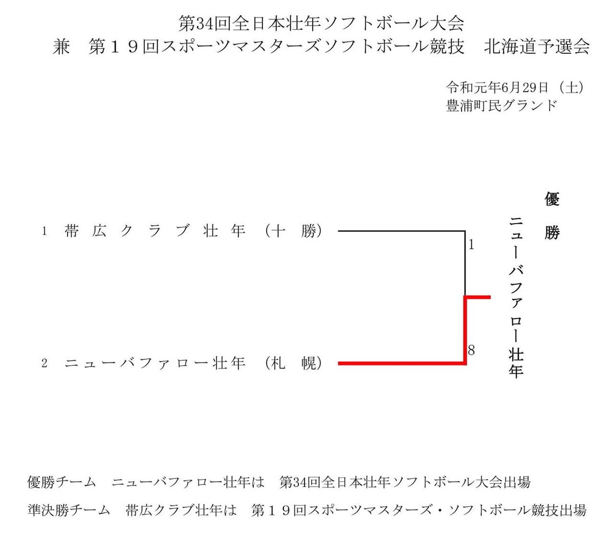 6月29日(土)、北海道・豊浦町民グランドにて『第34回全日本壮年大会北海道予選会(兼第19回スポーツマスターズ北海道予選会』が開催され、ニューバファロー壮年が帯広クラブ壮年を8対1で破り、優勝に輝いた。なお、ニューバファロー壮年は9月に岩手県花巻市で開催される全国大会へ、帯広クラブ壮年は9月に岐阜県揖斐川町で開催される第19回スポーツマスターズの出場権を得た。そのほかの結果は、下記のとおり。