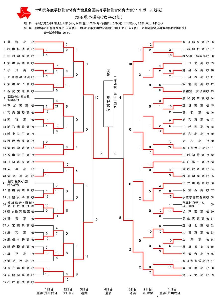 6月8日(土)~18日(火)、埼玉県・熊谷市荒川緑地公園、さいたま市荒川総合運動公園、戸田市営道満球場にて『令和元年度全国高等学校総合体育大会埼玉県予選会』が開催され、男子は埼玉栄高が秩父農工科学高を3対1で破り、女子は星野高が埼玉栄高を5対0で破り、それぞれ優勝に輝いた。そのほかの結果は、下記のとおり。