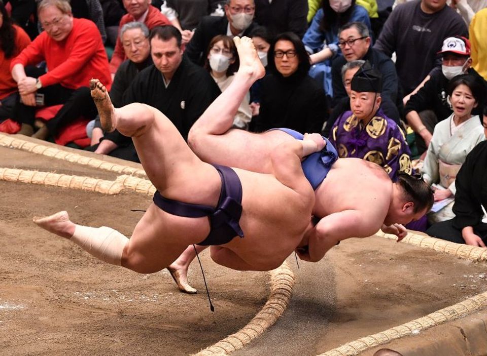 義ノ富士にモロ差しを許すも、とっさの首投げで相手を裏返した安青錦。このあと左手を早くつき、ヒヤリとさせたが、軍配どおりに白星を手にし、連勝とした