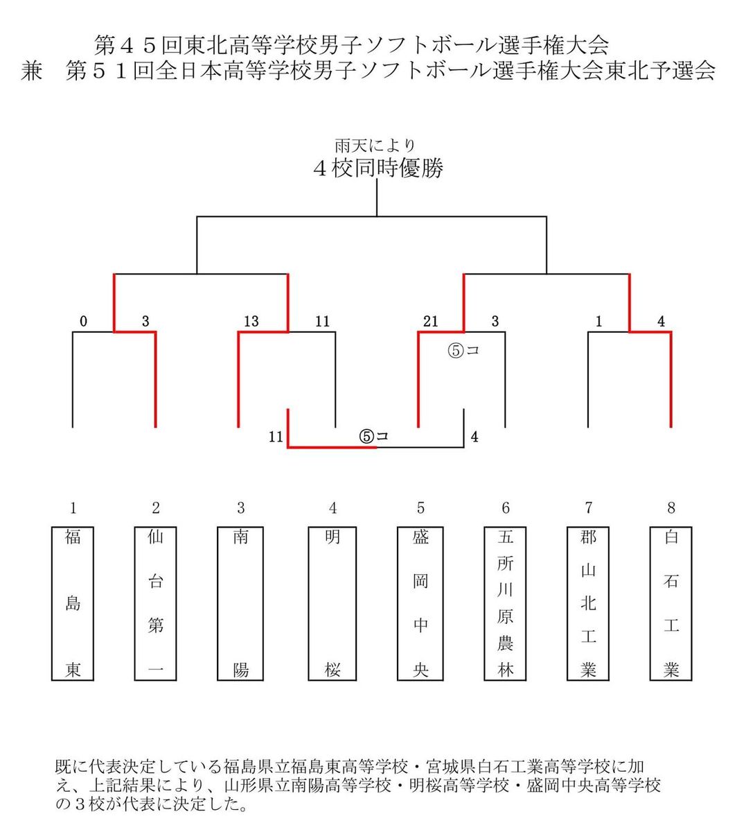 6月15日(土)、岩手県・石鳥谷ふれあい運動公園にて『第45回東北高校男子選手権大会(兼第51回全日本高校男子選手権大会東北予選会) 』が開催された。雨天のため、準決勝、決勝は行われず、仙台第一(宮城)、南陽(山形)、盛岡中央(岩手)、白石工業(宮城)がの4校が同時優勝に輝いた。そのほかの結果は、下記のとおり。