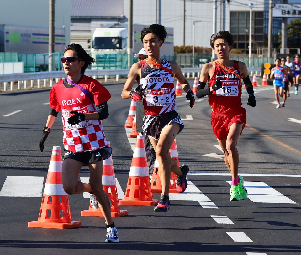 吉田の勢いは止まらず、10kmで7秒前を走っていたロジスティード、GMOインターネットグループ、プレス工業の3チームにも、13.3km付近で追いついた。そのまま前に行こうとしたが、橋本龍一(プレス工業)は後れたものの、今江勇人(GMOインターネットグループ)と平林清澄(ロジスティード)は離れない。しばらくして平林が前に出た。