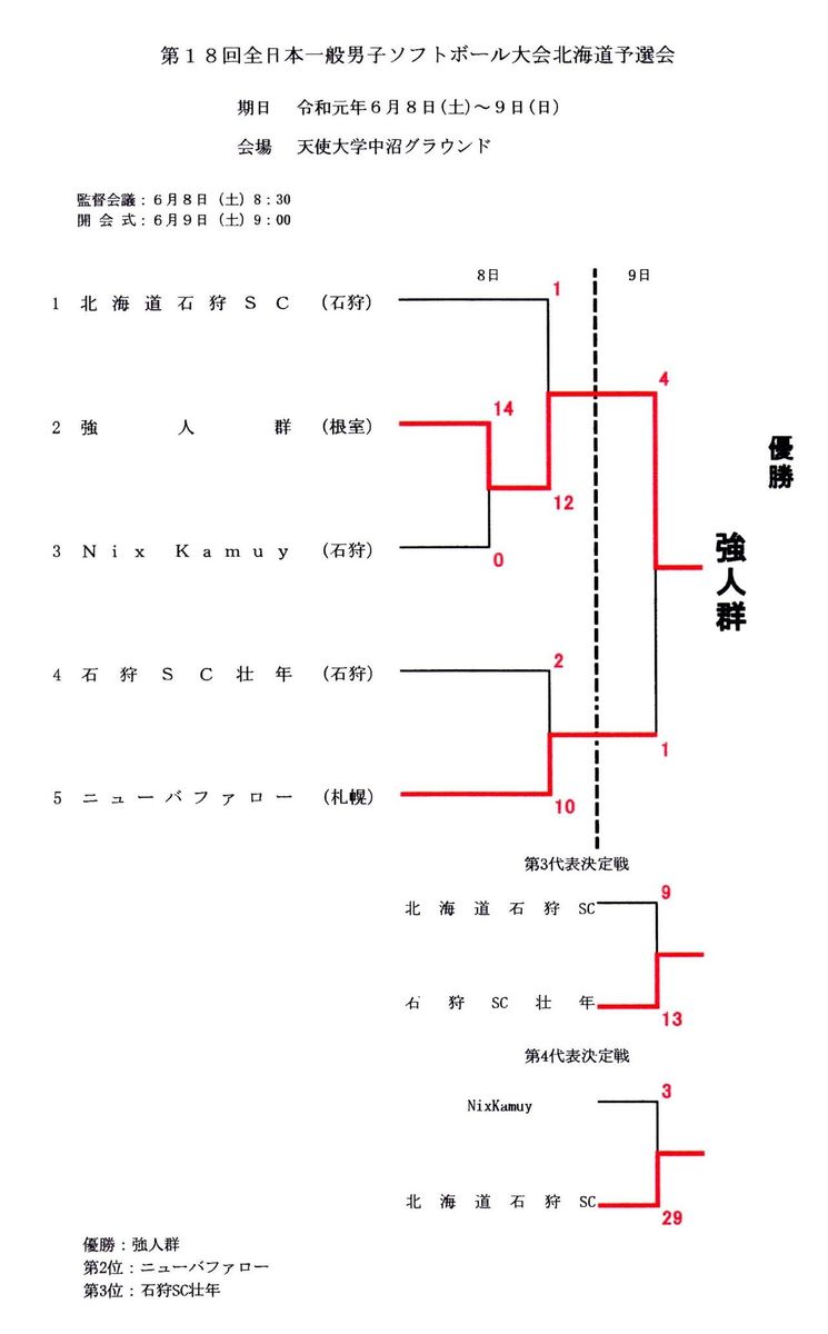 6月8日(土)から9日(月)まで、天使大学中沼グラウンドにて、『第18回全日本一般男子大会北海道予選 』が開催され、強人群がニューバファローを4対1で破り、優勝に輝いた。そのほかの結果は、下記のとおり。