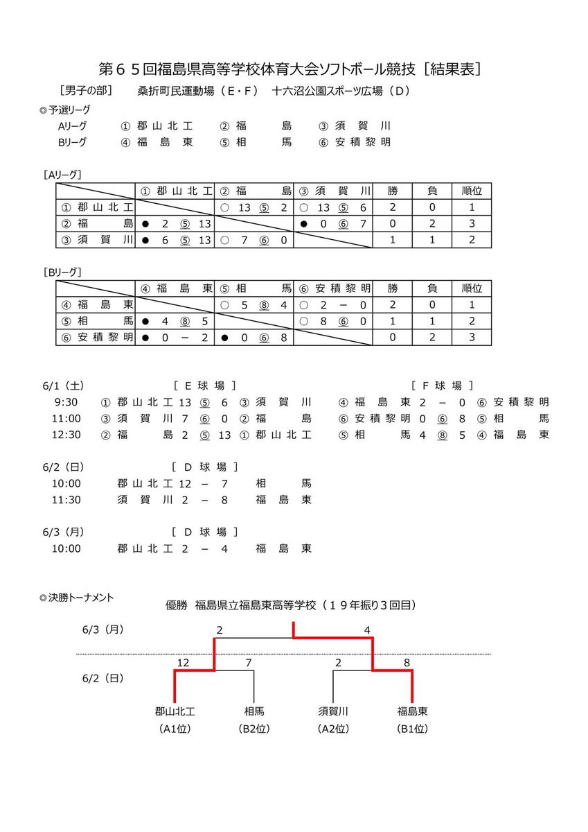 6月1日(土)から3日(月)まで、十六沼公園スポーツ広場、桑折町民運動場にて、『第65回福島県高校総体ソフトボール競技』が開催され、女子は学法石川高が帝京安積高を1対0で破り、男子は福島東高が郡山北工業高を4対2で破り、優勝に輝いた。そのほかの結果は、下記のとおり。