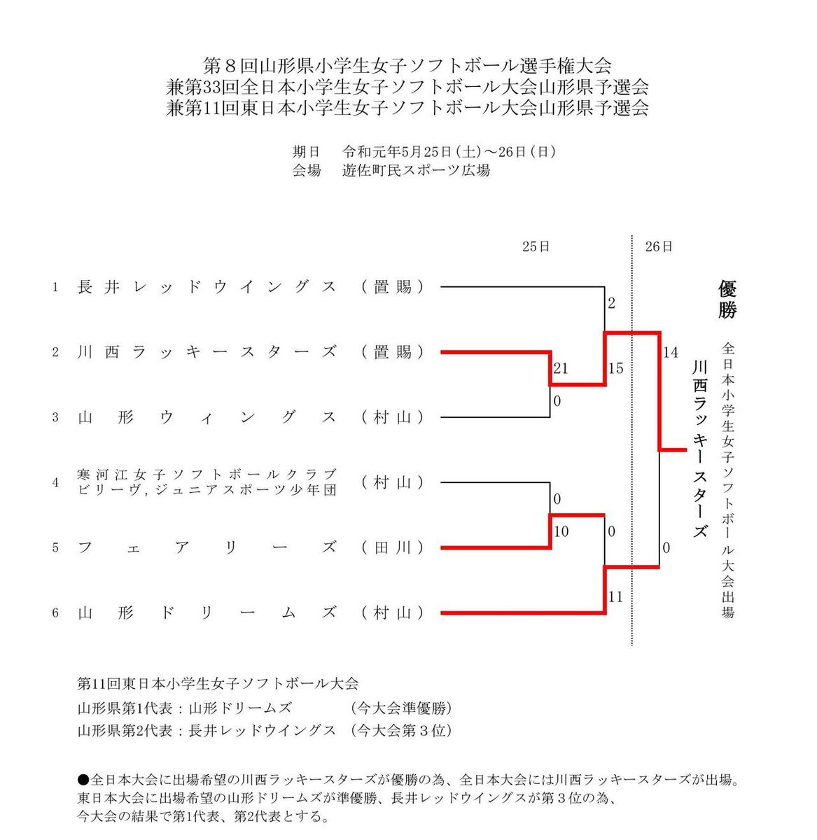 5月25日(土)から26日(日)まで、山形県飽海郡遊佐町・遊佐町民スポーツ広場にて、『第8回山形県小学生女子選手権大会(兼第33回全日本小学生女子大会山形県予選会、兼第11回東日本小学生女子大会山形県予選会)』が開催され、川西ラッキースターズが優勝。全日本小学生女子大会出場権を得た。結果は、下記のとおり。