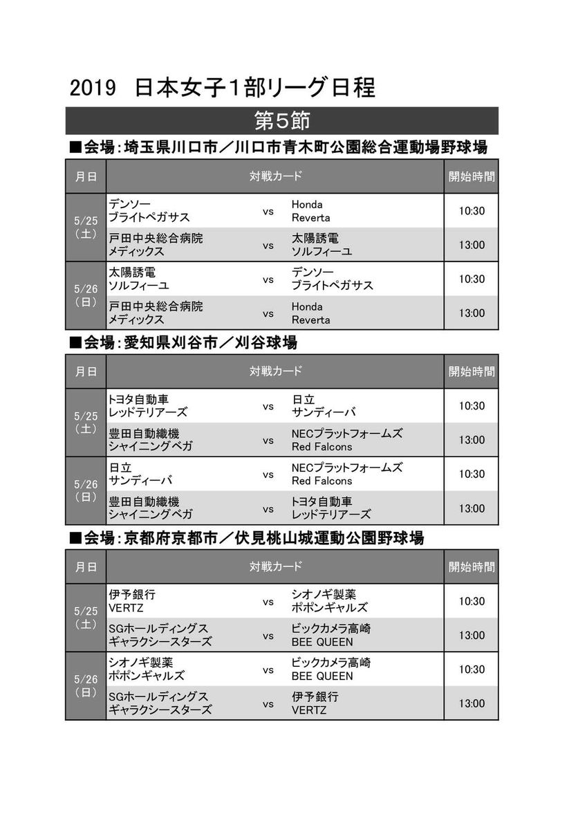 5月25日(土)、26日(日)に日本女子ソフトボールリーグ1部第5節が、埼玉県川口市・川口市青木町公園総合運動場野球場、愛知県刈谷市・刈谷球場、京都府京都市・伏見桃山城運動公園野球場にて開催されます。お近くの方は、ぜひ観戦に行かれてみては。