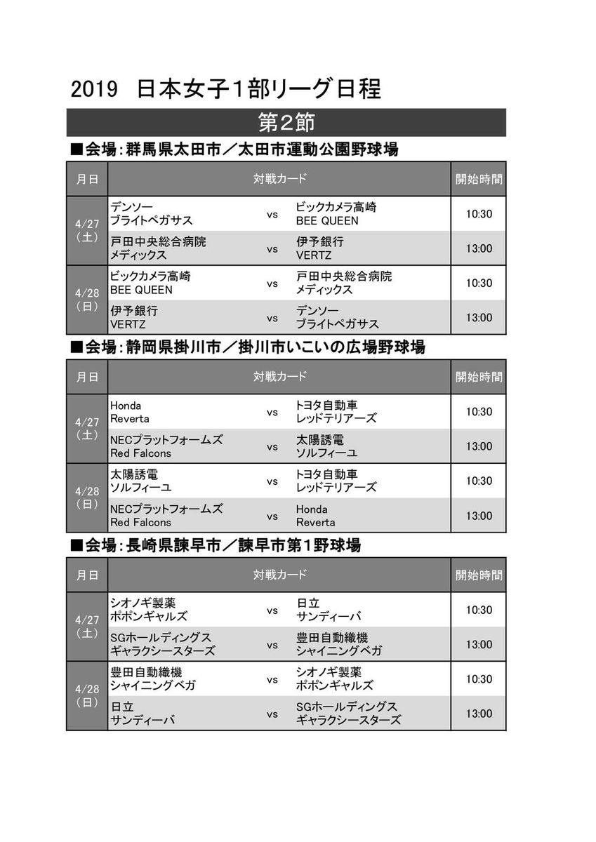 4月27日(土)、28日(日)に日本女子ソフトボールリーグ1部第2節が、群馬県太田市・太田市運動公園野球場、静岡県掛川市・掛川市いこいの広場野球場、長崎県諫早市・諫早市第1野球場にて開催されます。お近くの方は、ぜひ観戦に行かれてみては。