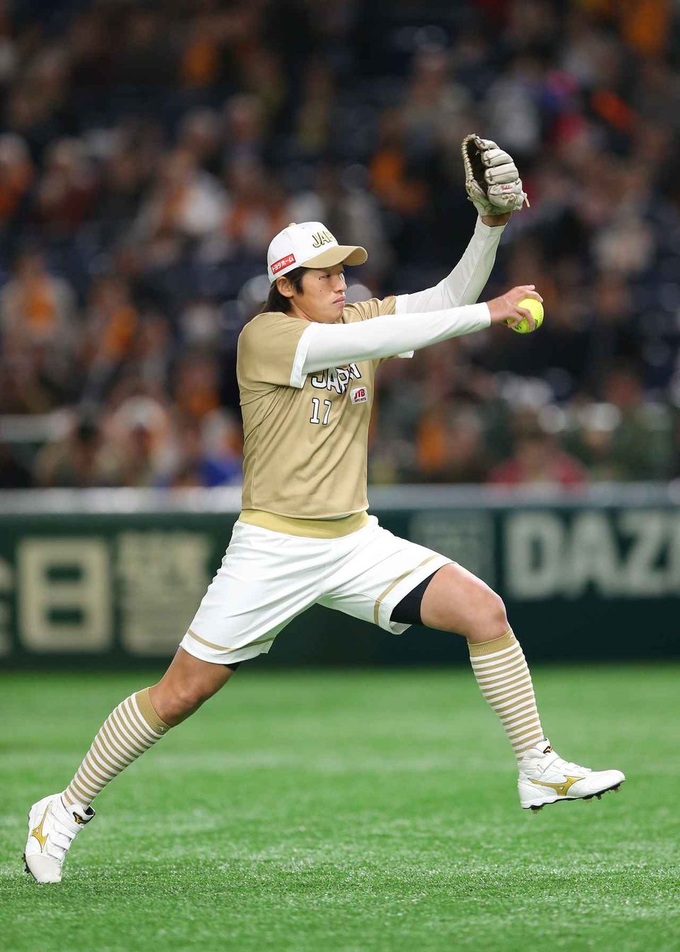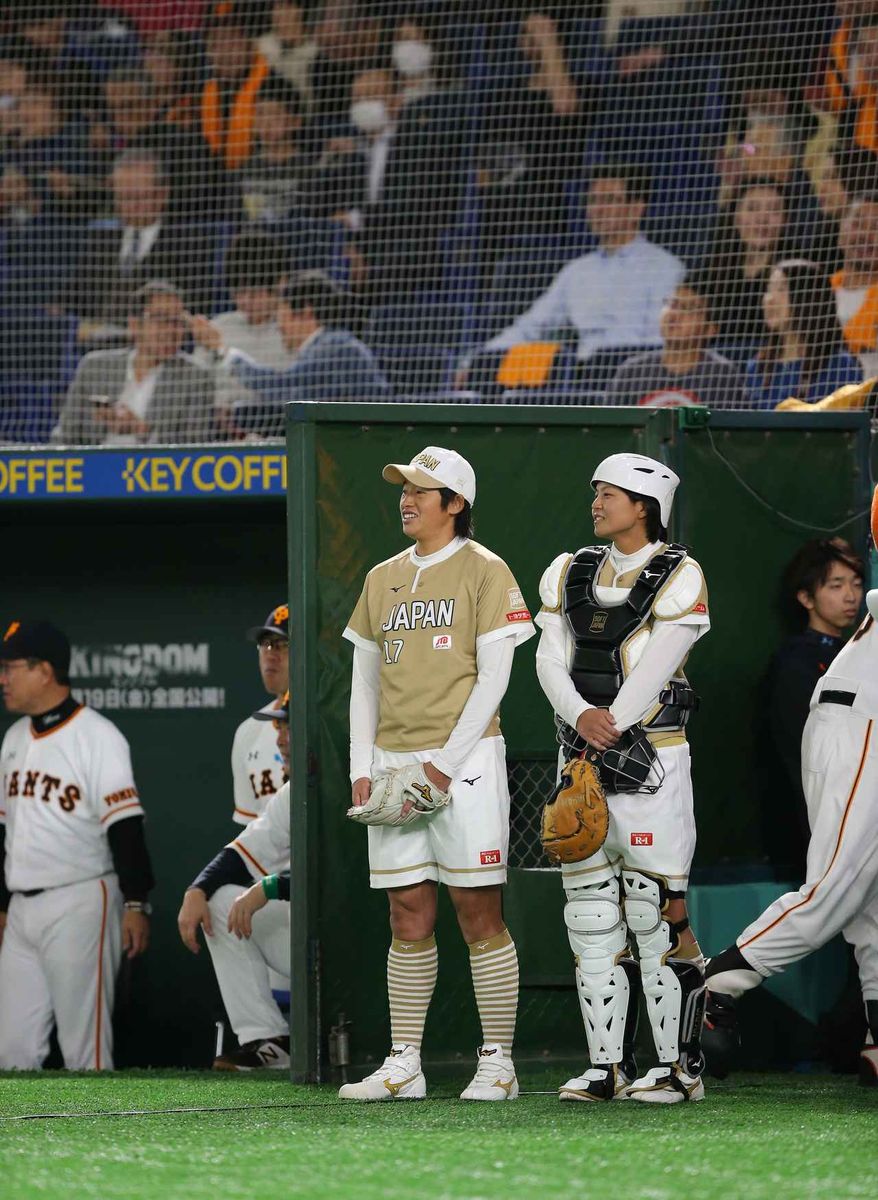 「今日は、(プロ野球ファンに)ソフトボールを知ってもらって、試合を見に行きたいと思ってもらえるような1球を投げられたらいいなと思っていた」と上野。ウィンドミル投法で投じたボールが我妻のミットに収まると会場からはどよめきが。上野と我妻は、所属チームのビックカメラ高崎でもバッテリーを組む間柄。大先輩・上野からの「なかなか良かったよね?」の問いかけに、後輩・我妻も「想像以上でした!!」と満面の笑みで答えた。