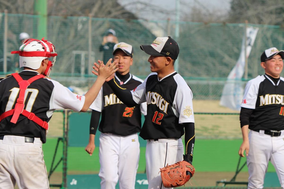 ※準決勝進出を決め、捕手の藤原琢磨と笑顔で握手を交わす中辻(写真中央)