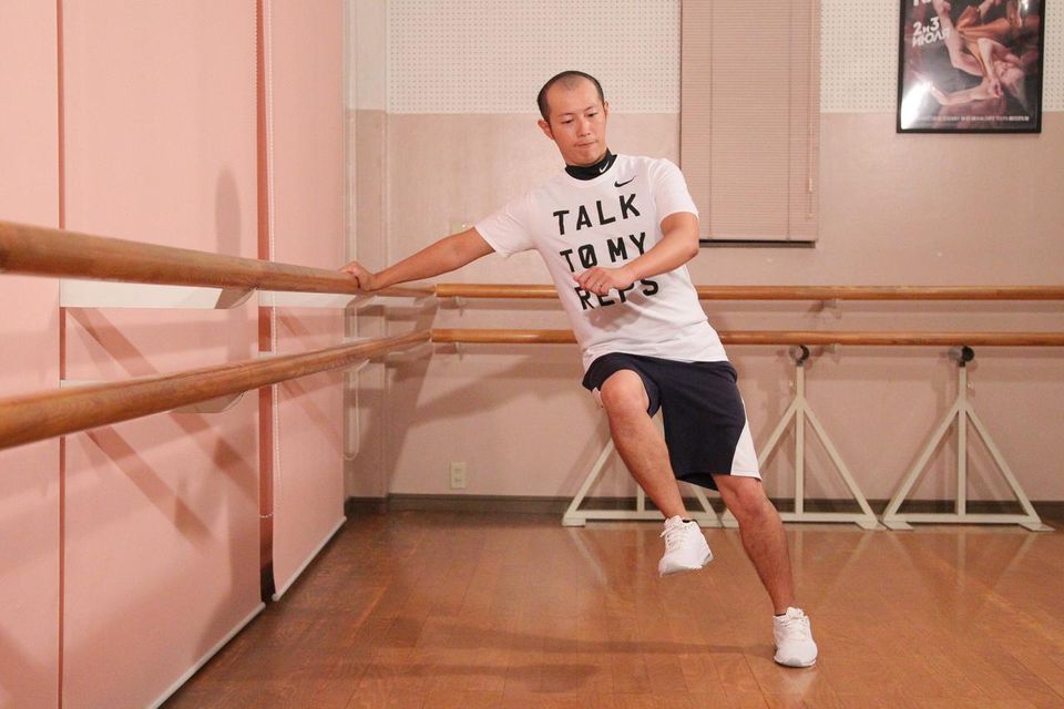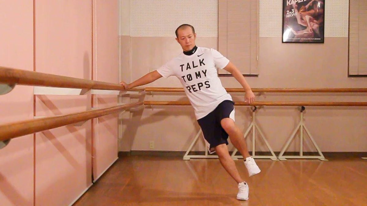 身体を倒せば倒すほど負荷が大きくなります。内側の足がガニ股、外側の足が内側に入り過ぎてはいけません。左右両方行い、ゆっくり10秒、素早く10秒を2~3セット行ってください。
