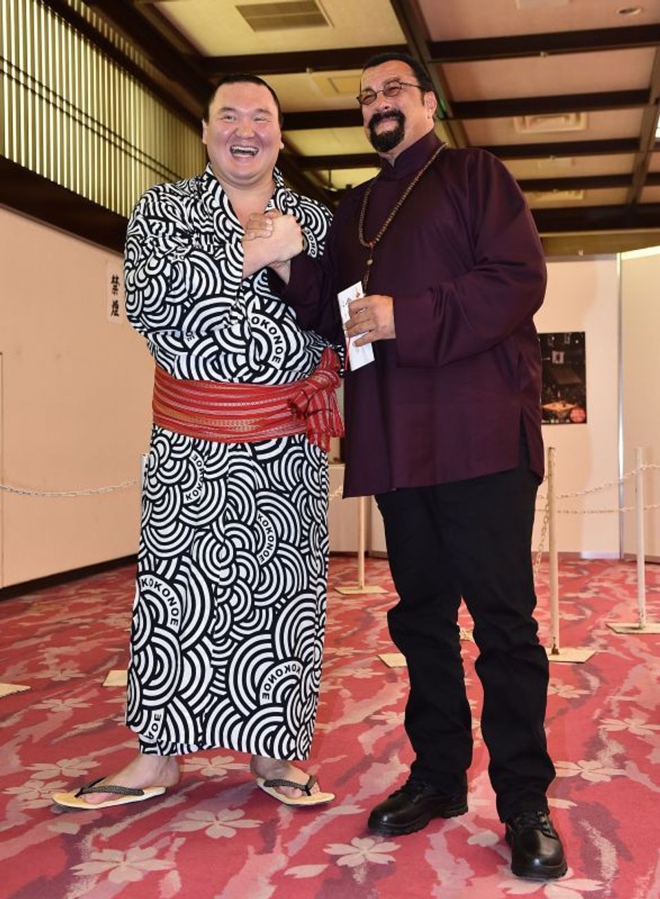 平成30年秋場所7日目の打ち出し後、白鵬は国技館大広間で「沈黙シリーズ」で有名なスティーブン・セガールと会い、ガッチリ握手。セガールの左手には懸賞金が握られていた