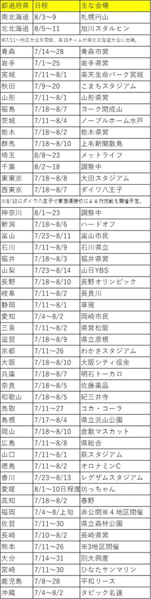 第102回全国高校野球選手権大会とその出場校を決める地方大会の中止が決まった5月20日以来、各都道府県高野連では代替の大会開催が検討されてきたが、49すべての地区での開催が決まった(7月7日時点)。各大会日程は表のとおり。