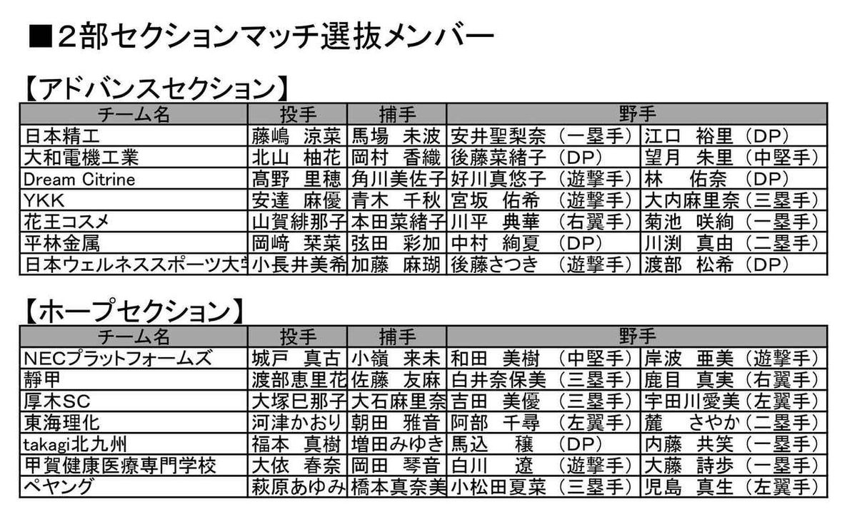 7月8日(日)、滋賀県草津市:草津グリーンスタジアムにて『日本ソフトボールリーグ2部セクションマッチ』が開催される。これは女子2部リーグの活性化のために行なわれるもので、いわゆるオールスター戦となる。