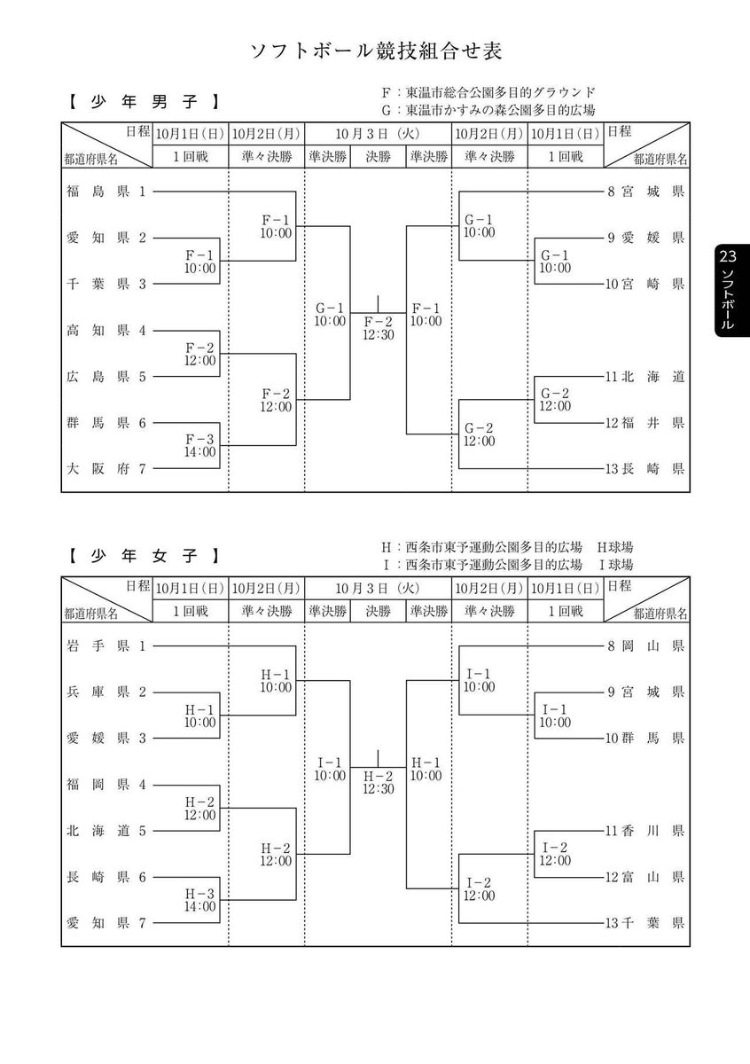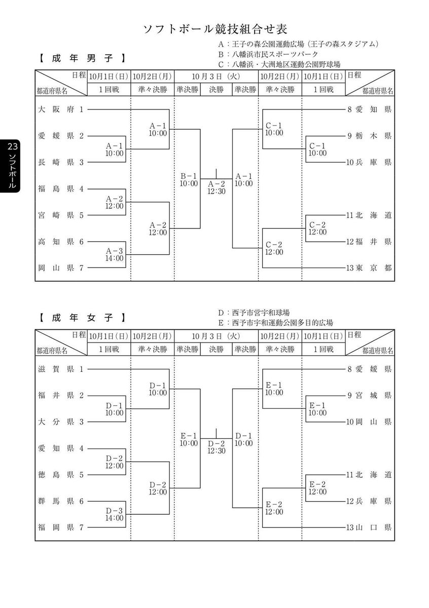ソフトボール競技は成年男女、少年男女それぞれで、北海道・東北・関東・北信越・東海・近畿・中国・四国・九州のブロックを勝ち抜いた13チームが本大会へ出場し、10月1日(日)に開幕、3日(火)に決勝が行われます。競技会場は、成年男子が八幡浜市・大洲市、成年女子が西予市、少年男子が東温市、少年女子が西条市がとなっています。