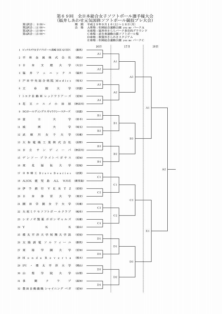 今年の大会は、福井県永平寺町の松岡総合運動公園you meパークをメイン会場に、福井市、越前市、敦賀市が会場となっています。組み合わせは次の通りです。