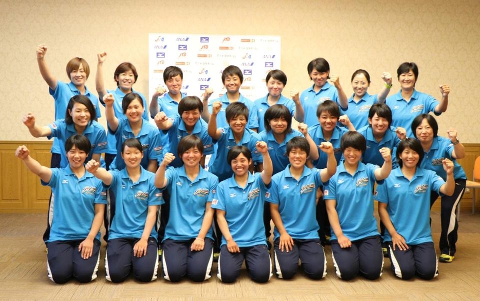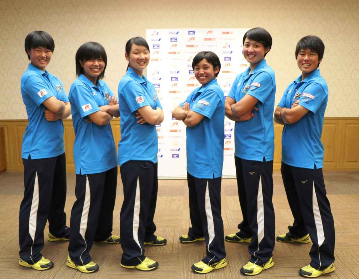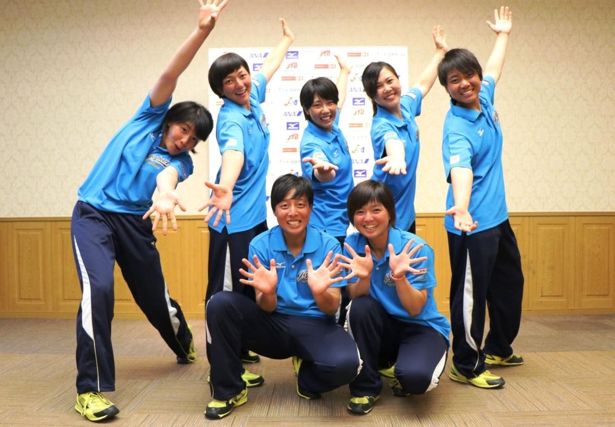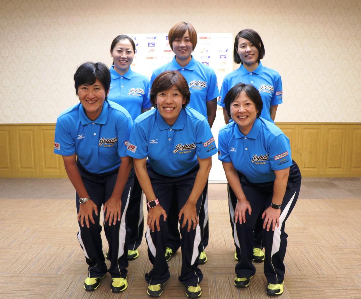 チームを支えるスタッフ陣。下段左から齋藤春香チームリーダー(日本協会)、木田京子ヘッドコーチ(園田学園女子大)、佃文子トレーナー(びわこ成蹊スポーツ大)、上段左から染谷美佳アシスタントコーチ(デンソー)、佐藤理恵アシスタントコーチ(東京女子体育大)、山口憲子マネジャー(日立)