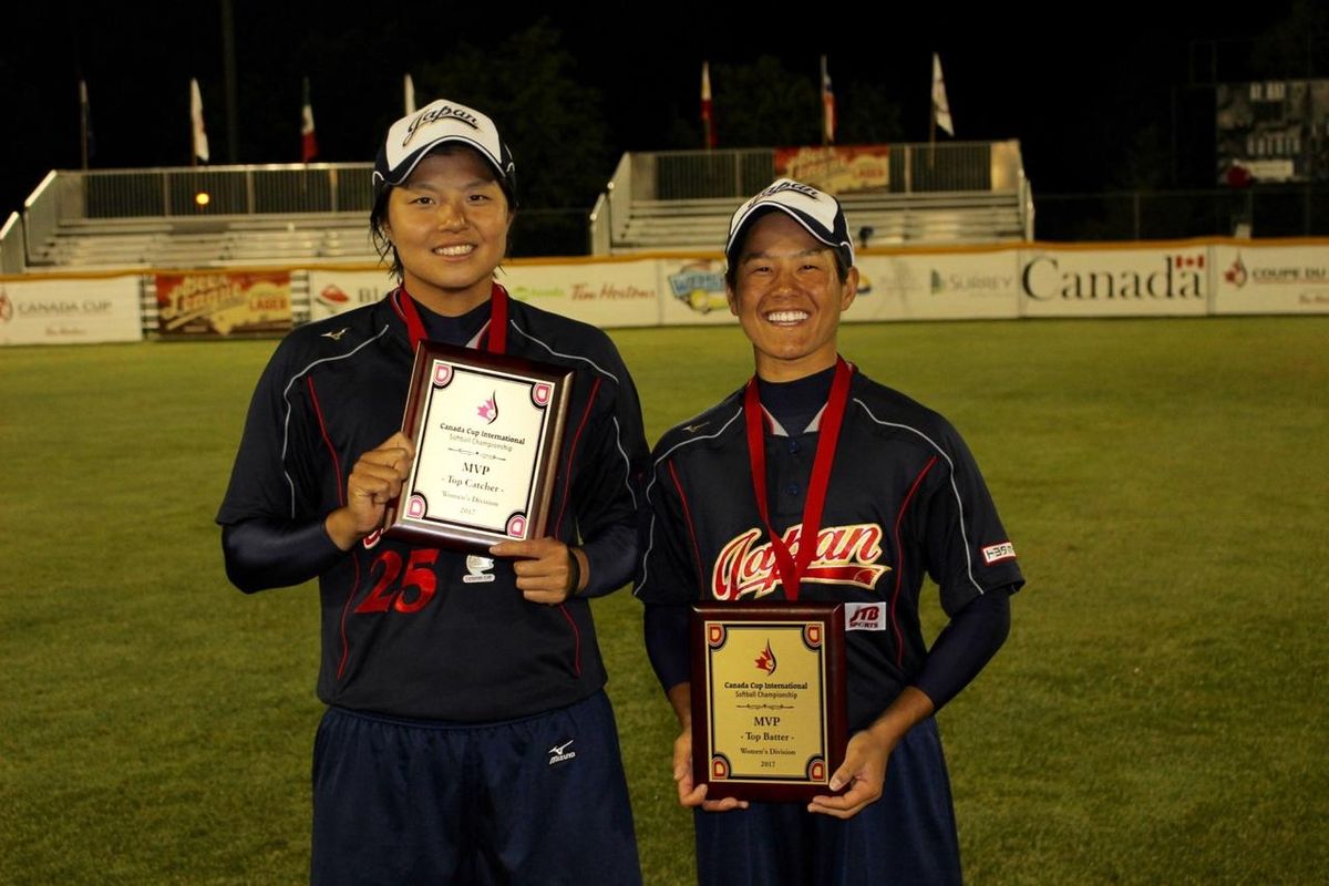 大会を通して最優秀捕手賞に輝いた我妻悠香と最優秀打撃賞を受賞した江口。さわやかな笑顔を見せた