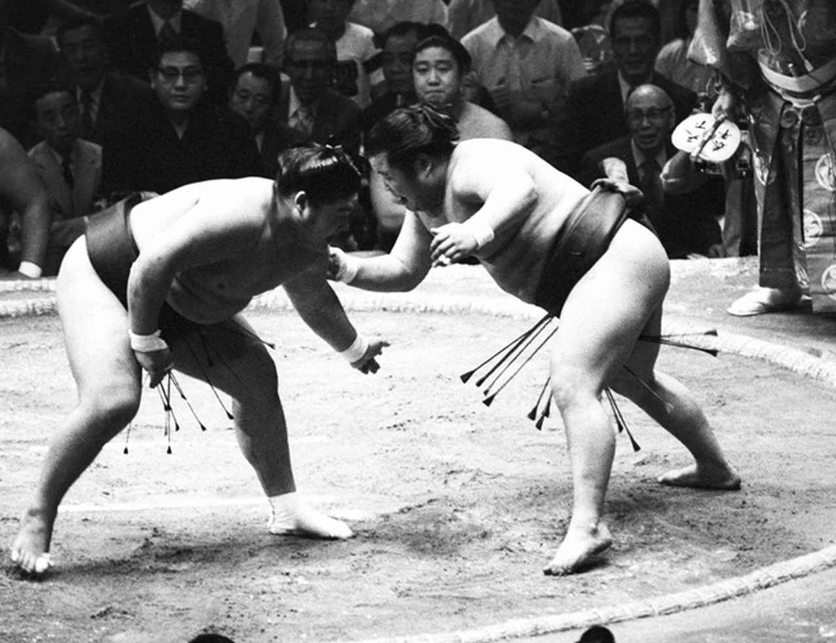 昭和50年夏場所8日目、天覧相撲で麒麟児(左)と壮絶な押し合いを披露した
