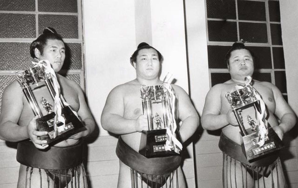 ※写真上=3横綱を総なめにした昭和49年初場所、2度目の技能賞を受賞した富士櫻(左は敢闘賞の魁傑、中央は殊勲賞の北の湖)