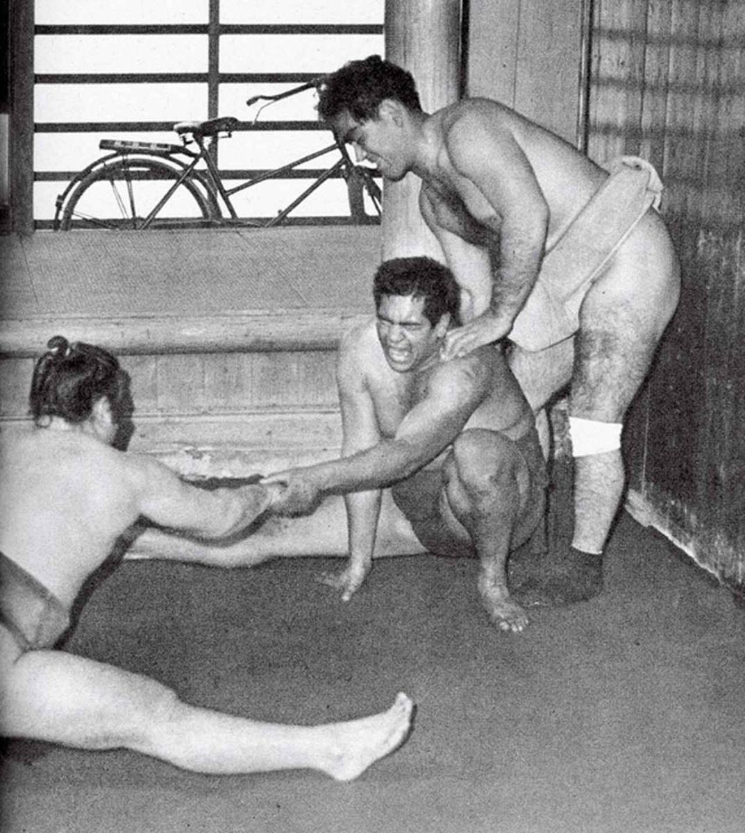 入門間もないころ、股割りに悲鳴を上げるジェシーこと高見山