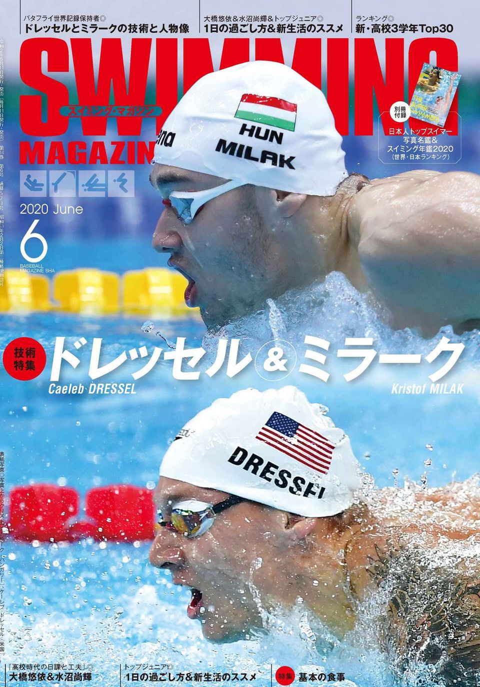 巻頭特集では昨年のワールドシーンの中心となった、男子バタフライ世界記録保持者のケーレブ・ドレッセル(米国)とクリストフ・ミラーク(ハンガリー)のふたりを徹底解剖しています。