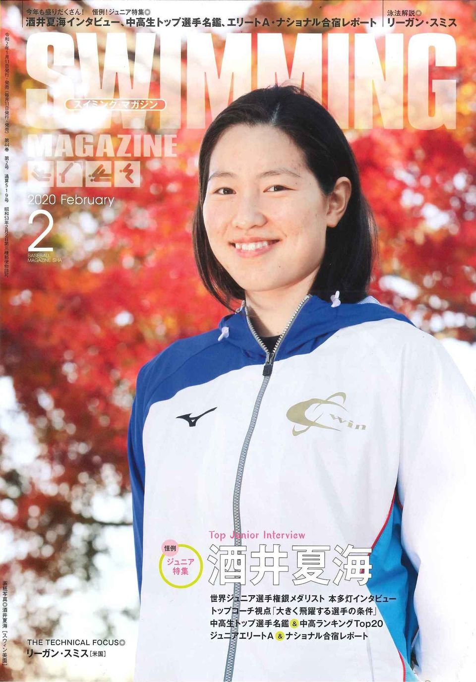 表紙と巻頭のトップジュニアインタビューは、世界選手権に出場した背泳ぎの酒井夏海選手(スウィン美園)。中学3年でリオ五輪に出場してからキャリアを積み上げた今、東京五輪に懸ける思いとは。