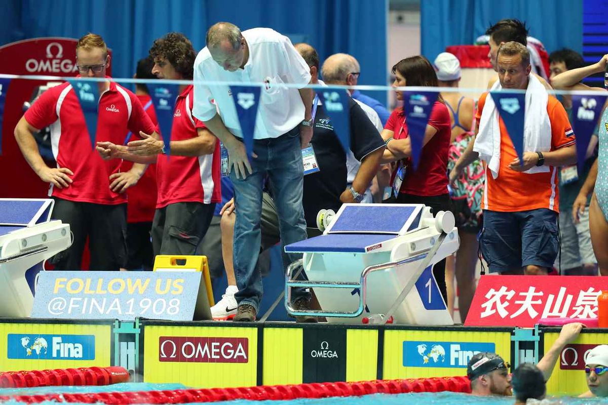 写真/22日の午後セッション前、バックストローク・レッジの調整を懸命に行なうスタッフ(撮影◎毛受亮介/スイミング・マガジン)