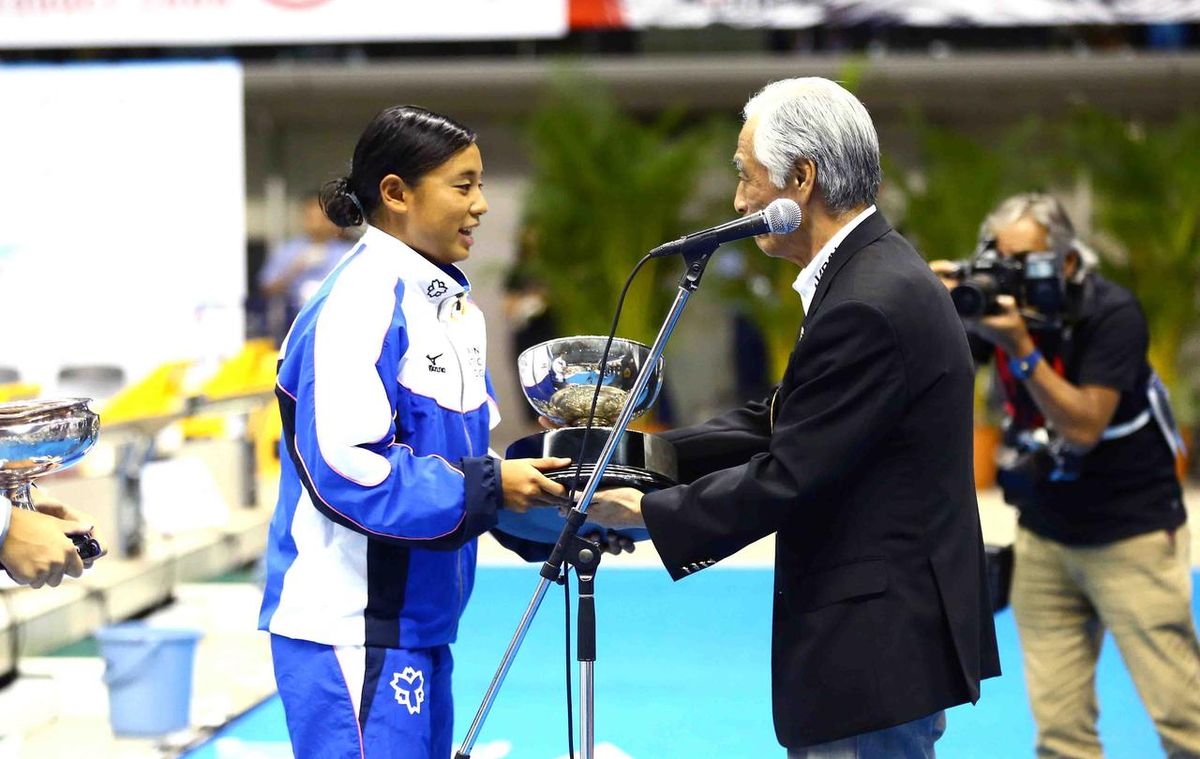 19回目の女子総合優勝を果たし、青木剛・日水連会長(右)から賜杯を受け取る日本体育大女子主将の関口美咲