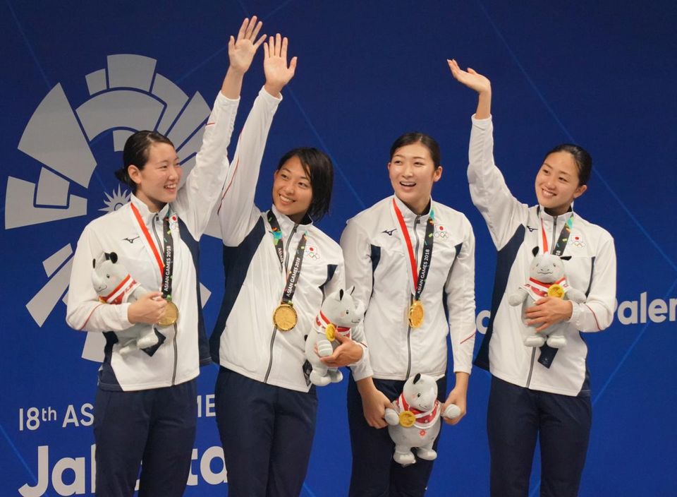 ※パンパックで樹立した日本新記録を、さらに上回った女子メドレーリレーは2大会連続の日本新(左から酒井夏海、鈴木聡美、池江璃花子、青木智美)