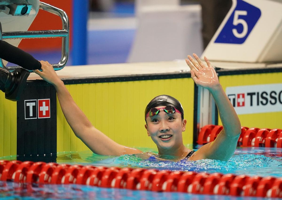 「今日の目標にしていた個人2種目が獲れてうれしいです。(50mバタフライの直後に100m自由形の決勝でしたが?)50mバタフライの直後で疲れていたので、100m自由形で53秒2(正式には53秒27)も出ているとは思っていなかったんですけど、泳ぎも崩れなかったし、前半落ちついて入って後半しっかり上げられて良い記録が出たと思います。(表彰式の進行が予定通りにいかないことについて)途中からそういうことを楽しめるようになってきました。パンパシフィック選手権からこっちに来て、音楽の雰囲気とか違いますけど、だいぶ慣れて楽しめるようになりました」