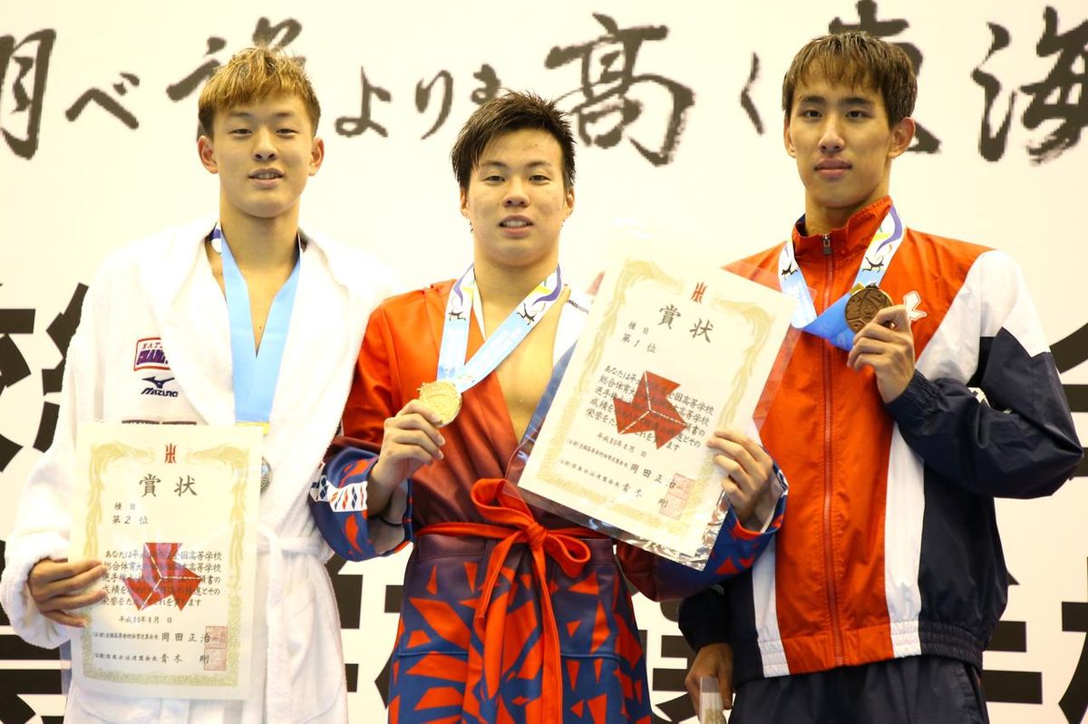男子200m平泳ぎ表彰。写真中央が優勝した林太陽(埼玉・武南2年)。左が2位の谷口卓(東京・日大豊山2年)、右が3位の白石崇大(広島・市立沼田3年)