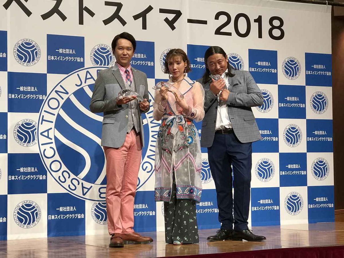 (一社)日本スイミングクラブ協会主催の「ベストスイマー2018」の表彰式が6月14日、都内のホテルにて開催された。この賞は、水に親しみ年間を通して泳いでいる人物、水泳をこよなく愛し水泳が似合う社会的影響力のある方に贈られるもので、19回目を迎えた今年は、同協会外部の受賞者として、女優の仲里依紗さん、俳優の金子貴俊さん、お笑いタレントのロバート・秋山竜次さんの3名が選出された。