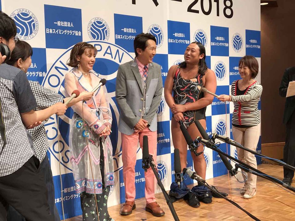 また表彰式後の会見では、仲さんがファッションとしてセパレート水着を身に着けてきたことを話すと、おもむろに「実は僕も」とおもむろにジャケットを脱ぎ始め、競泳用水着姿になり、笑いを誘っていた。