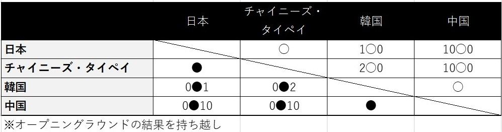 日本とチャイニーズ・タイペイが決勝に進出したが、試合が雨天中止となり、スーパーラウンドを3勝0敗の首位で勝ち抜いていた日本の2大会連続3回目の優勝が決定した。
