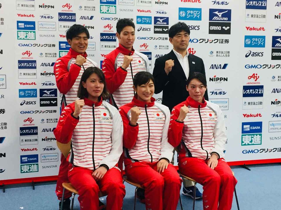 会見には、1国2名を対象にした世界ランク8位相当の派遣Ⅰを破った萩野公介(ブリヂストン)、幌村尚(早稲田大2年)、池江璃花子(ルネサンス亀戸)、大橋悠依(イトマン東進)、青木玲緒樹(ミキハウス)の5名に平井伯昌ヘッドコーチが出席。5人のうち、唯一、4年前の両大会に出場経験のある萩野は「水泳は個人種目と思われがちですが、近年はチーム日本として戦ってきているので、チームのために頑張りたい」と言えば、日本選手権4冠をすべて日本新記録で飾った池江は「パンパシは東京で行なわれるので、より水泳を身近に感じてもらえる良い機会。より多くの方々に足を運んでいただければ」と来る夏に向けて、さらなる高いパフォーマンスを見せたいと、抱負を語った。(上写真後列左から幌村、萩野、平井コーチ、前列左から大橋、池江、青木)