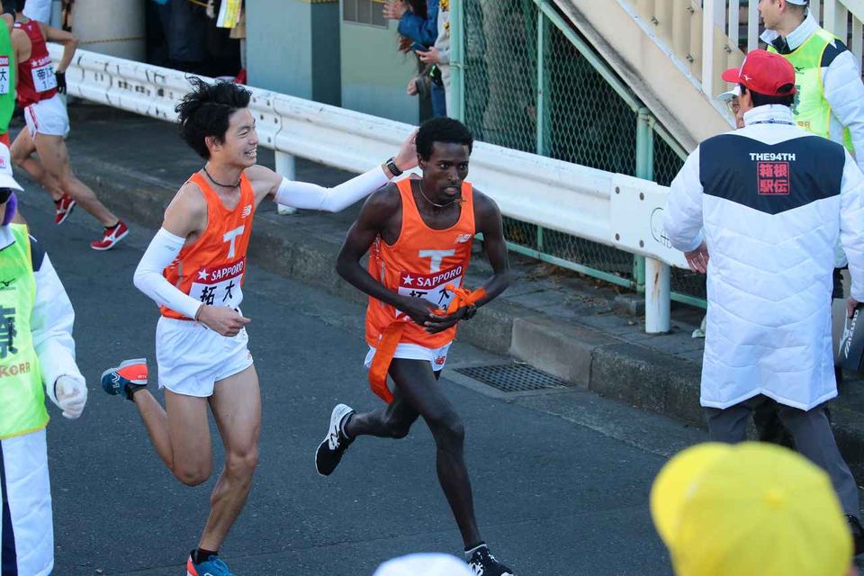 ※写真上=前回は馬場とデレセが第1中継所でタスキリレー。主将と副主将の立場で臨む今回も快走が期待される(写真/荒川祐史・陸上競技マガジン)