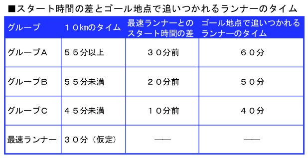 例えば、グループAは最速ランナーより30分先にスタートする。最速ランナーがスタートする時点で、すでに30分走っているわけだ。それを追いかける2人は10kmを30分で走るわけだから、10kmを60分で走る人がゴール地点で最速ランナーに追いつかれることになる。