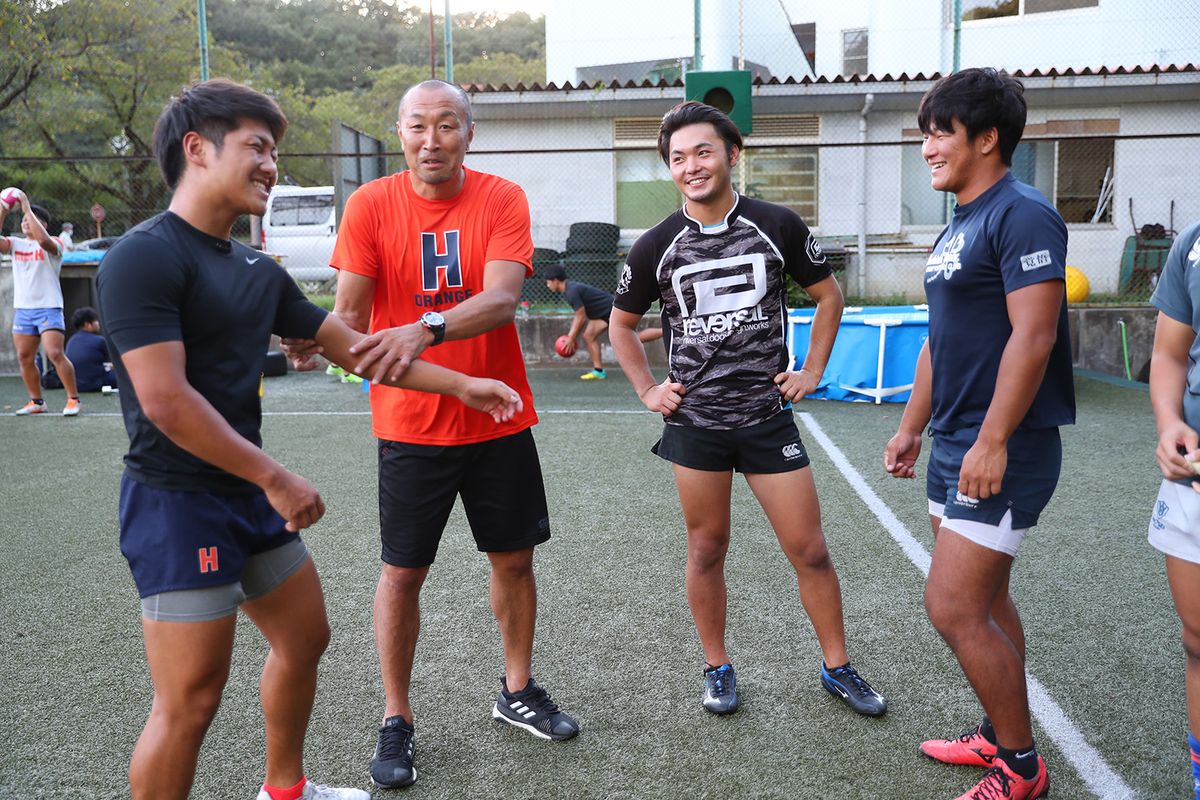 練習前の部員たちを、本当に一人ずつ紹介してくれる勢いで、「おい、ラグマガに載るぞ!!」といって集めてくれました。