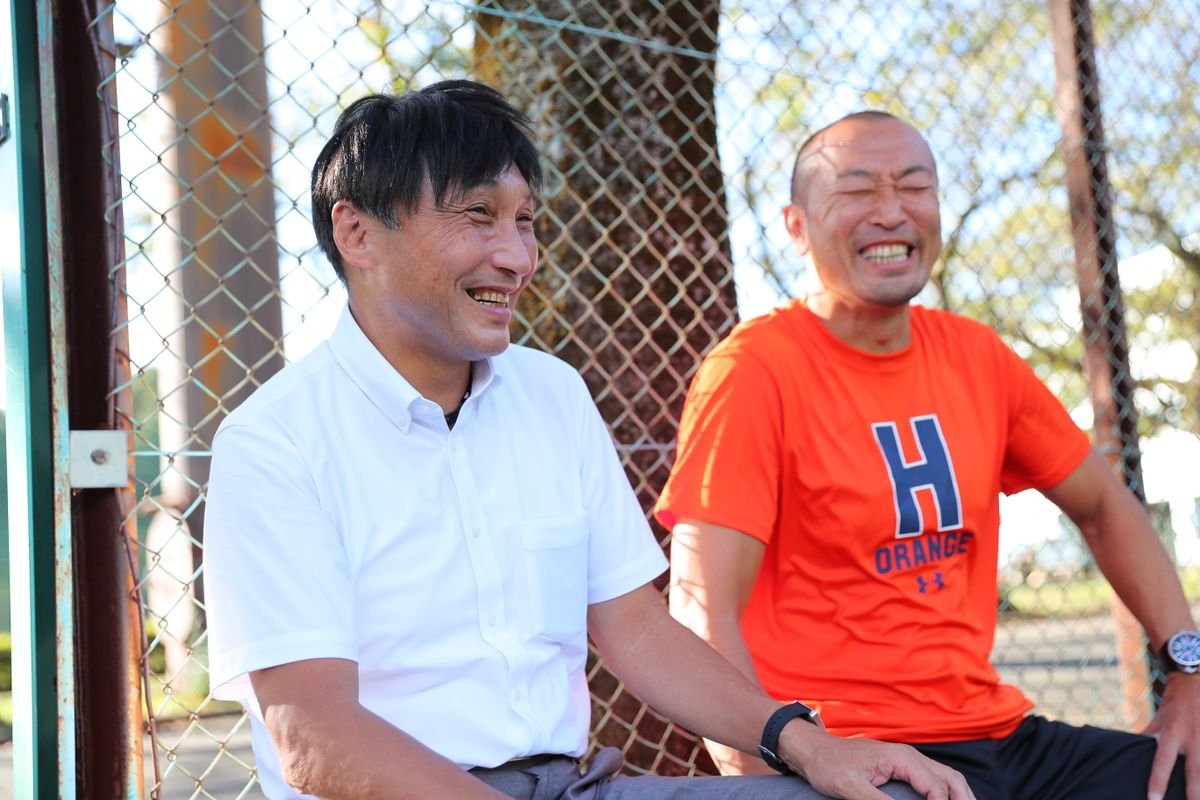 右が苑田右二ヘッドコーチ(タケオミさんの2つ後輩)。色違いのHマークでばっちりですね。