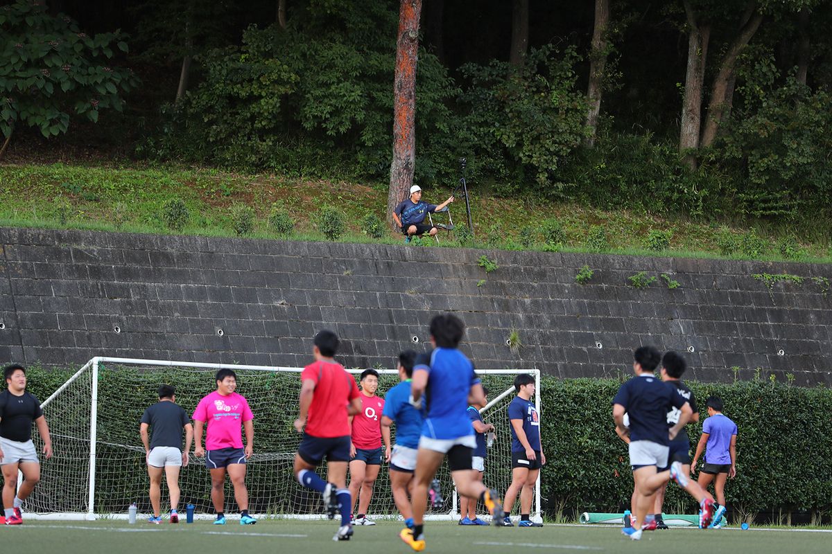 法政のグラウンドは、高い石垣に囲まれています。その日は暑い日だったのですが、その石垣の上に、ずっとビデオ撮影をしている学生スタッフもいました。「あいつも撮ってやってください!」。