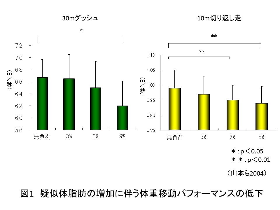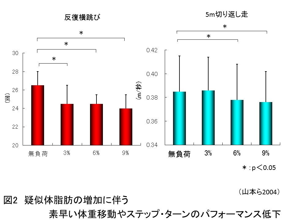 以上の結果から分かるように、体脂肪率の増加は体重移動を伴うスピードや動作の切り返し能力の明らかな低下につながってしまいます。