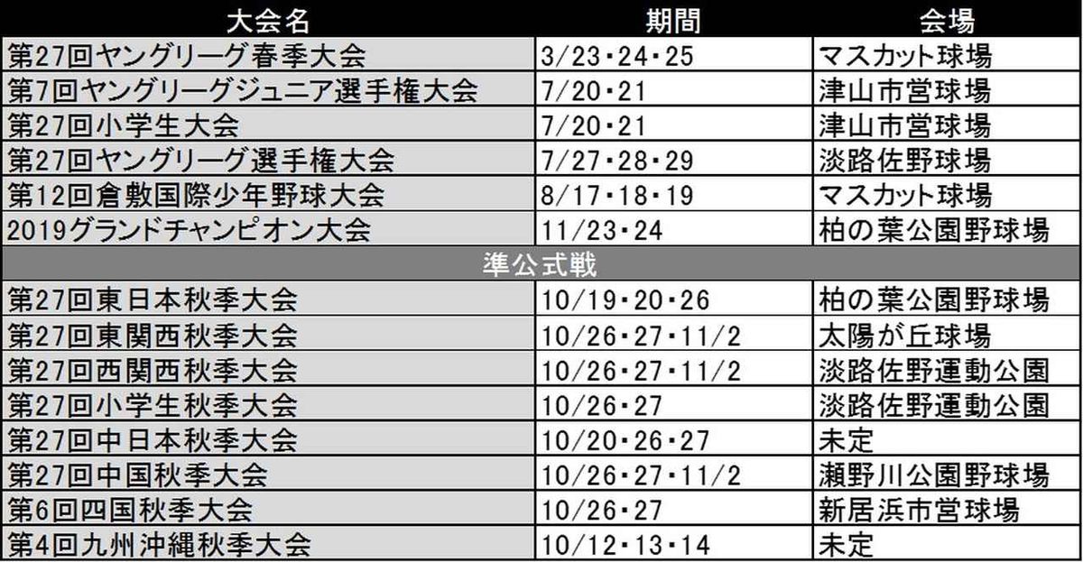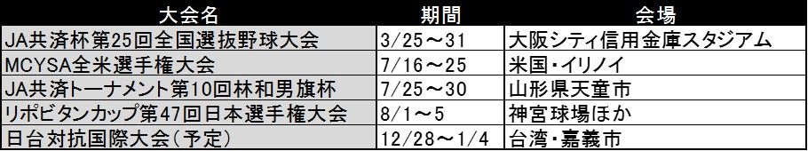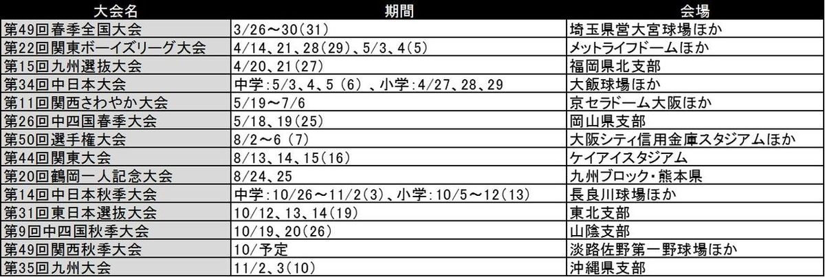 中学硬式野球各リーグのリーグ主催公式大会の日程は以下のとおり。(※順次更新)